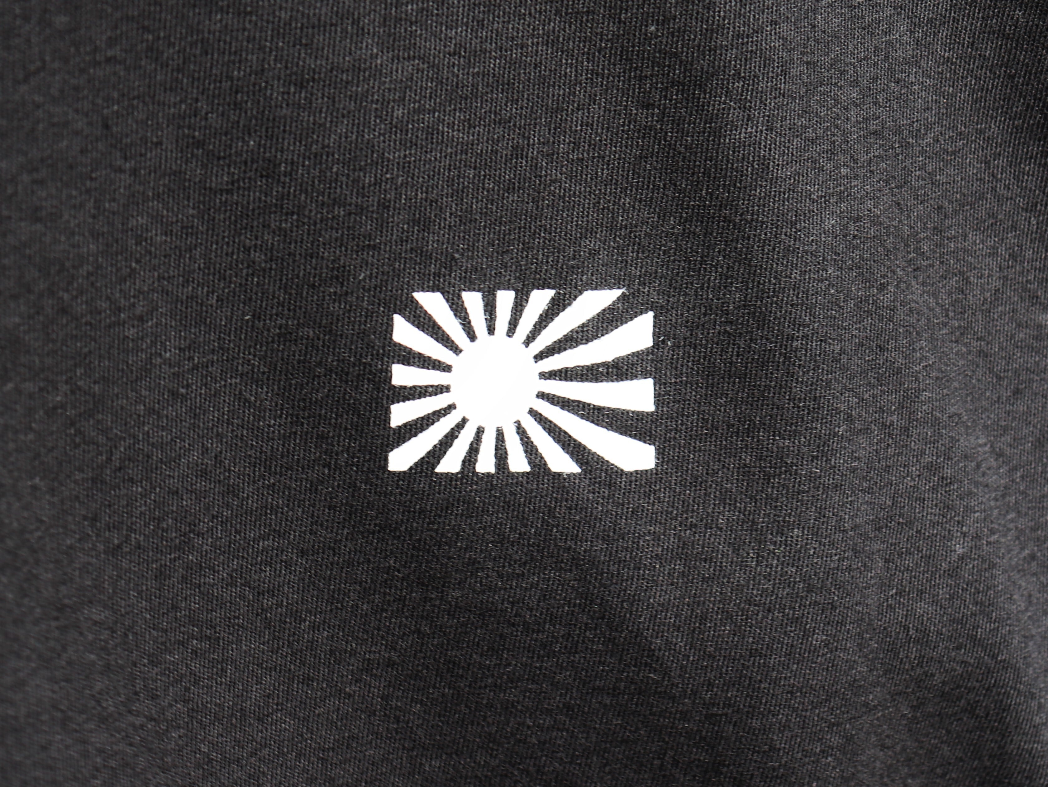 Tシャツは、黒地にモノトーンの旭日旗を胸元にあしらったシンプルで上品な一枚。落ち着きがありながら程よい存在感で、普段の装いにも自然に馴染みます。