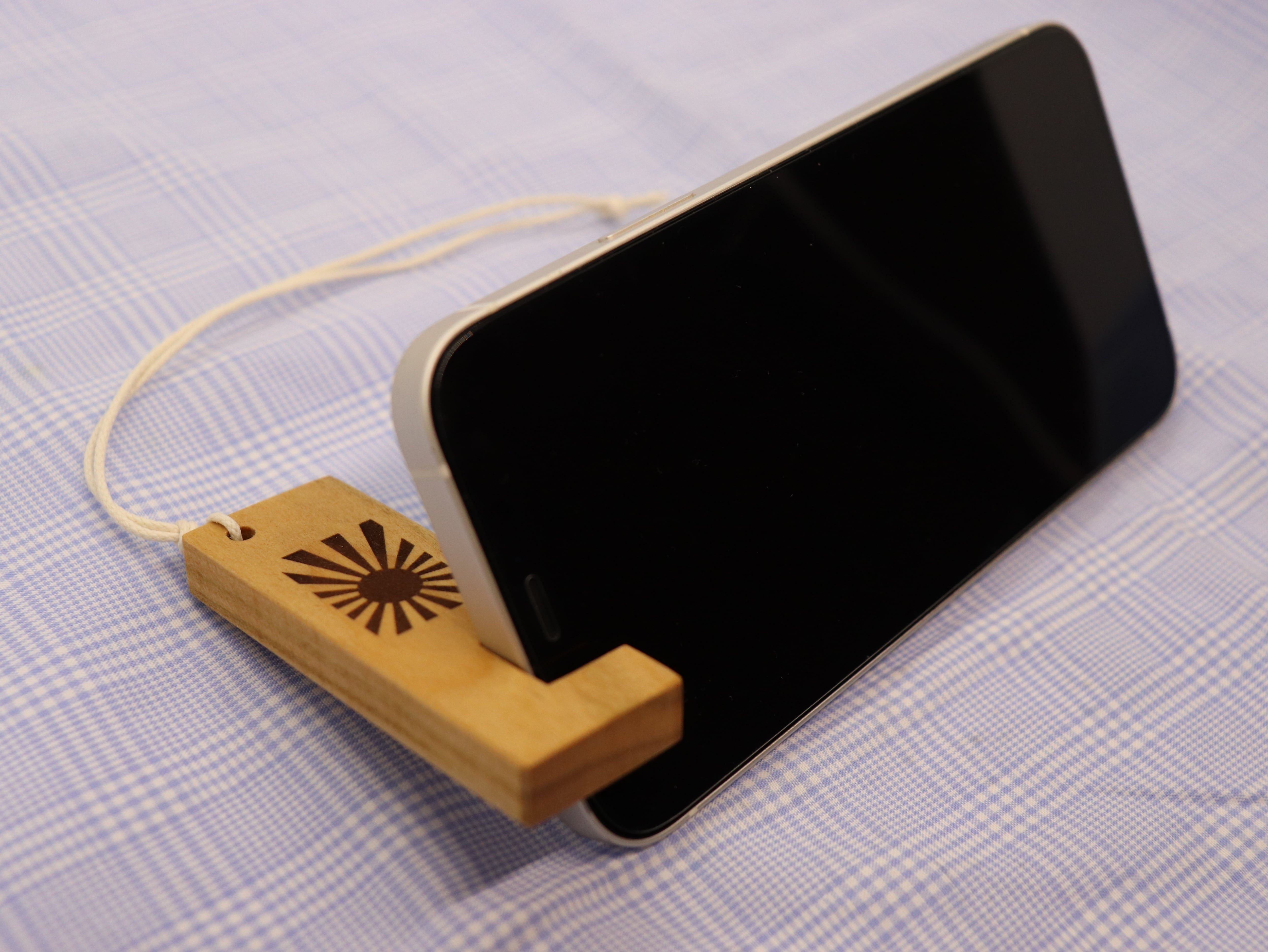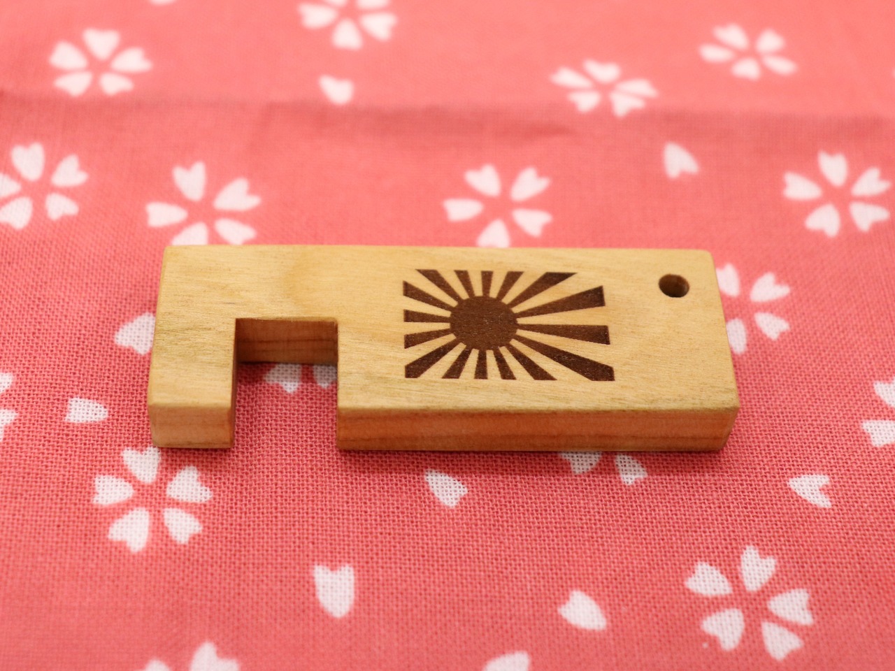 山桜で仕上げたキーホルダー型スマホスタンド<旭日旗>は、出先でもさっと取り出してスマホを立てられる、便利なアイテム。