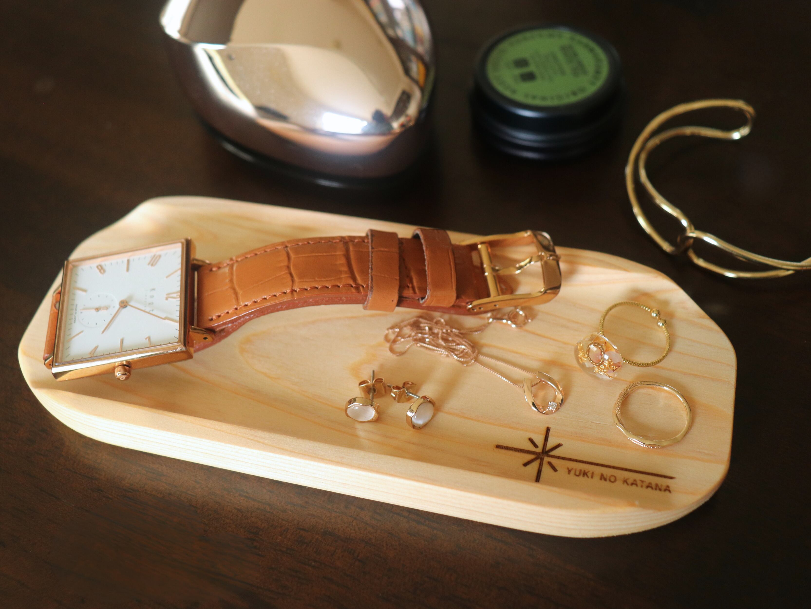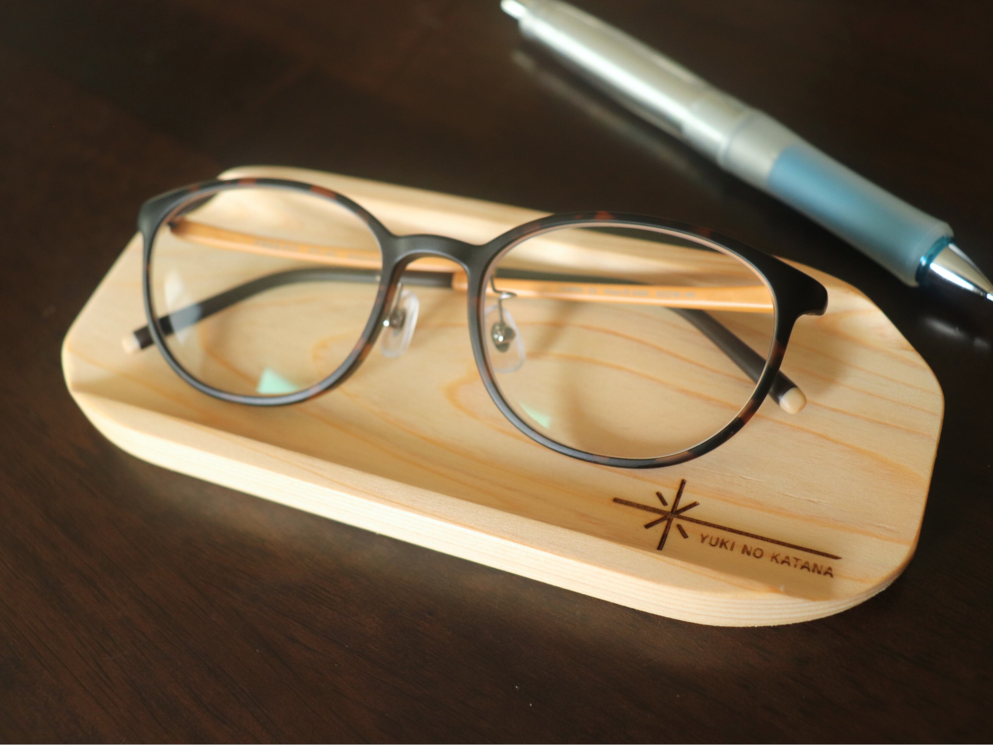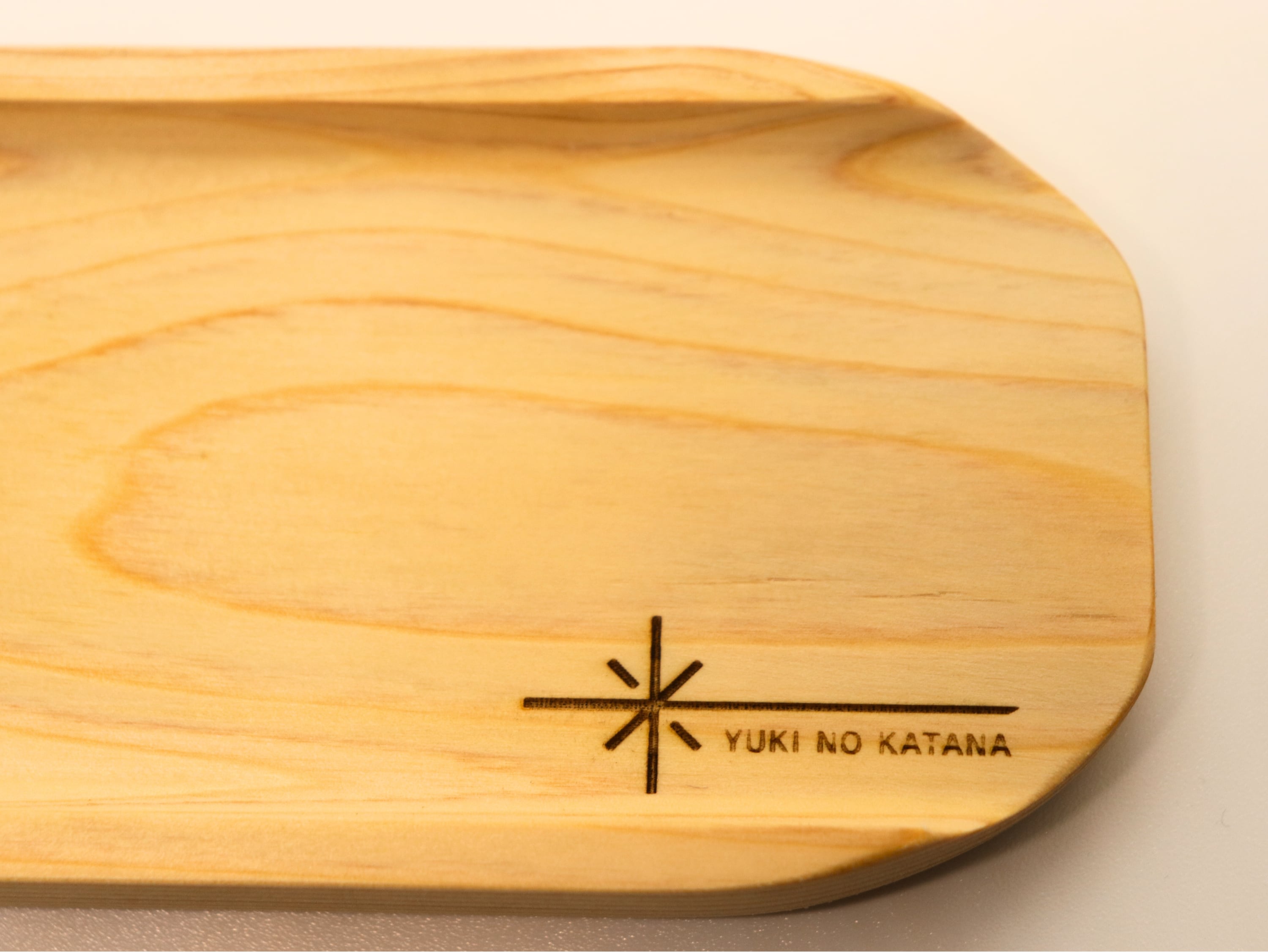 当ショップのオリジナルブランド「YUKINOKATANA」ロゴをレーザーで刻印。トレイの端にさりげなく配置することで、シンプルで洗練された印象に仕上げました。細やかな刻印の調整を重ね、木の風合いと調和する、上品で落ち着いたデザインになっています。